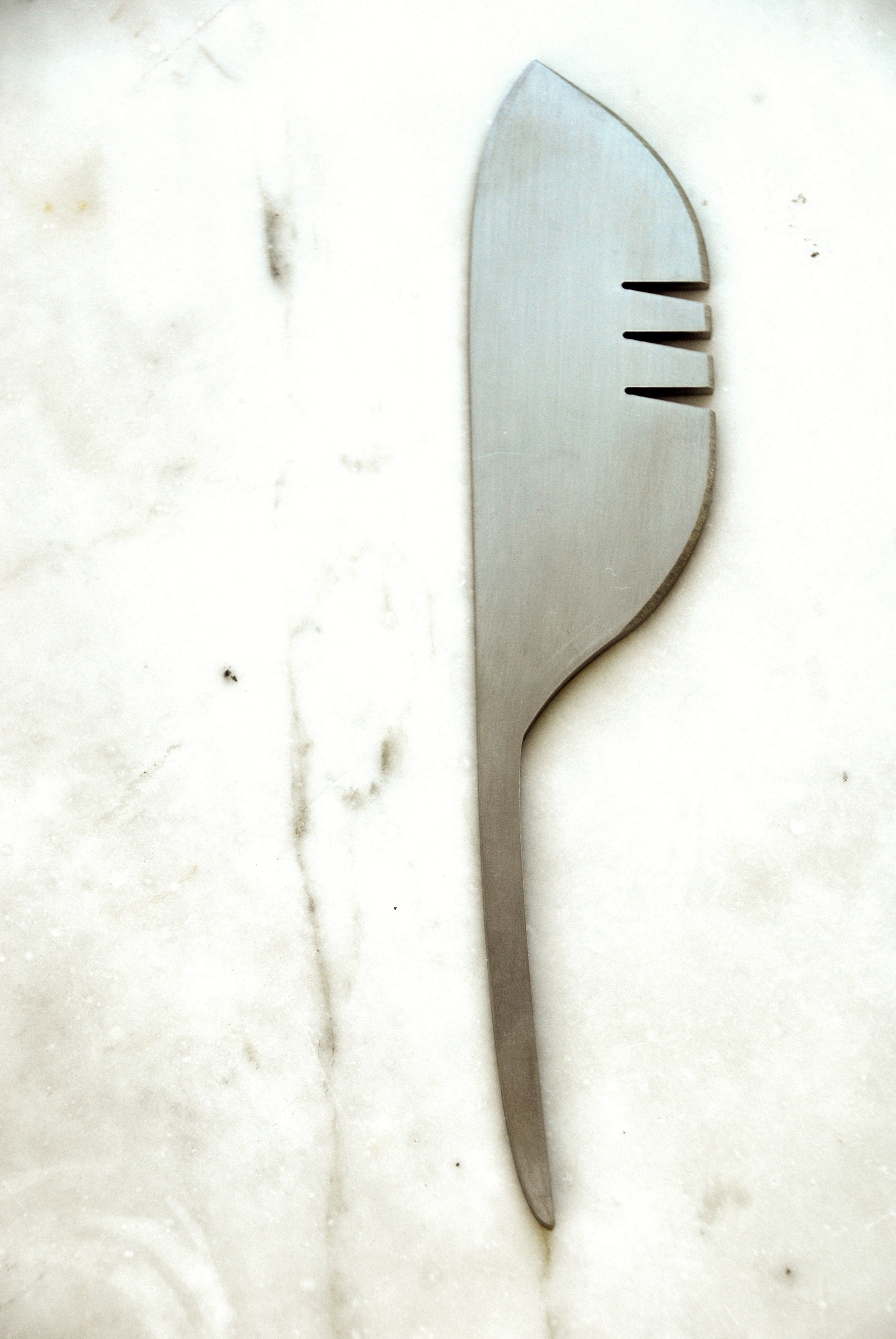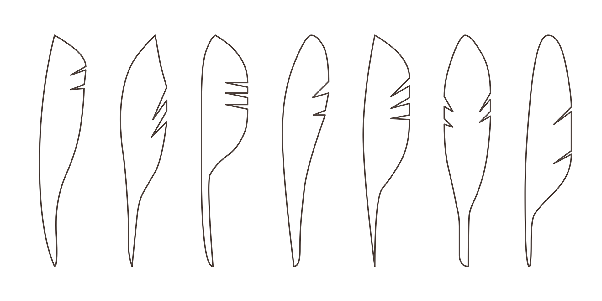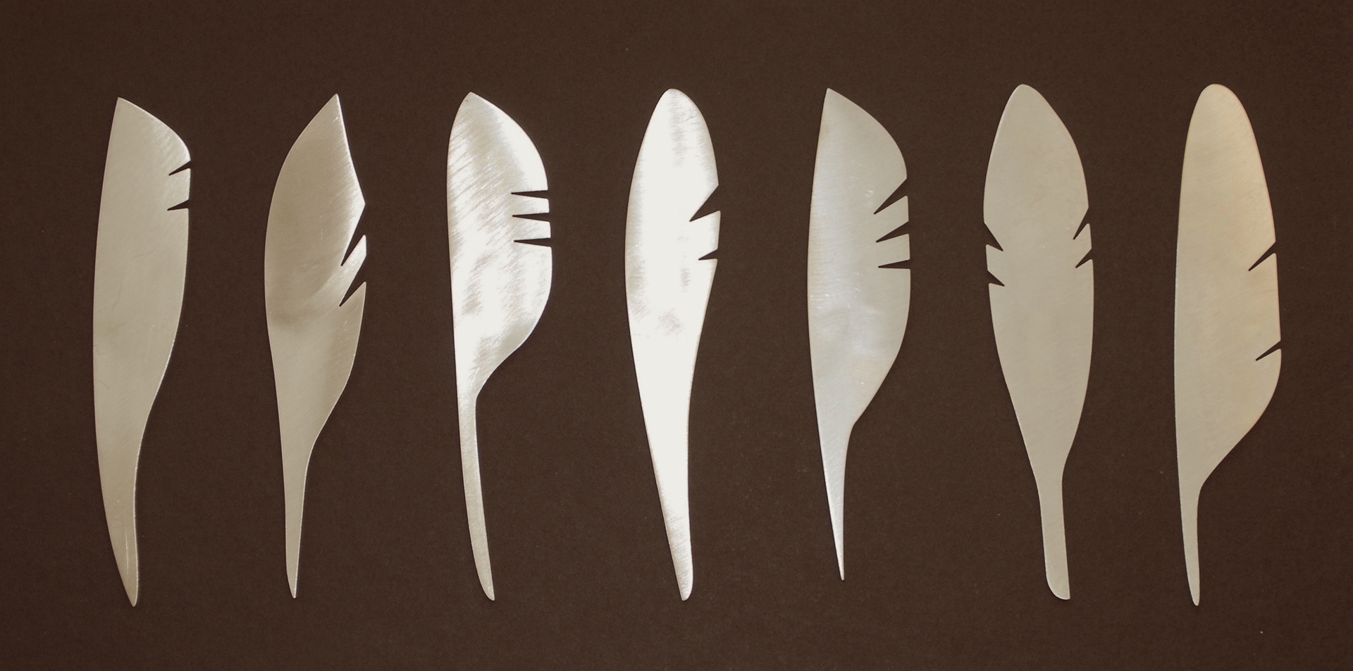 het ontwerp van een serie messen gebaseerd op de vorm van veren als pen, want woorden kunnen ook snijden.